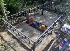 Затем мы приступили к монтажу заранее привезённой на кладбище простой металлической оградки. Параллельно с установкой ограждения мы окончательно очистили участок, а также сварили металлический каркас по периметру могилы. Он не только придаст дополнительную жёсткость ограждению, но и послужит бортами для будущего покрытия.