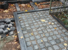 Этап непосредственно самой работы не представлен широким портфолио, работа была тяжелая и не всегда руки доходили до фотоаппарата. Могу лишь сказать, что было очень не просто доставить до могилы столько гранита. Ниже фото создания бетонного цоколя и этап укладки брусчатки.