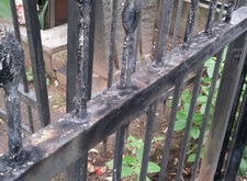 Это старая и мощная ограда. По словам клиентов ей более 60 лет. Достаточно длительный срок нижняя часть ограды находилась в земле, это ускорило коррозию металла, некоторые прутья разболтались, и задняя часть ограды провисла. Необходимо было отремонтировать ограду и покрасить ее.