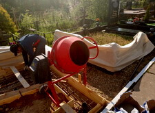 Первым делом мы принялись за демонтаж находящихся на участке объектов. Цоколь был снесён без труда, однако с удалением основания плиты возникли проблемы. Его не удалось сломать даже отбойным молотком, в результате было принято решение оставить его как есть.