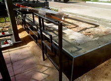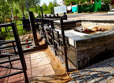 Далее представлено промежуточное состояние участка: полностью собран каркас, уложена брусчатка, установлены подставки под памятники и цветники.