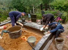 Укрываем место захоронения геотекстилем и приступаем к сборке и установке памятников.