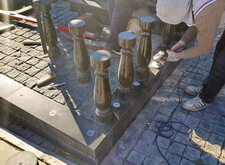 В углу участка делаем лавочку. Брусчатку под её ножками зачищаем, всё выставляем по уровню, для дополнительной надёжности конструкция удерживается е только на клею, но и на штырях. Параллельно делаем верх одного из памятников.