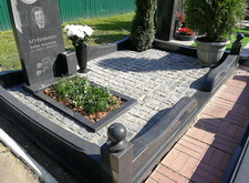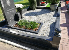 На нижеприведённых фотографиях представлен окончательный вид места захоронения. Мы поставили на место памятник, сделали цветник, уложили внутрь участка гранитную брусчатку. По периметру места захоронения проходит старый цоколь, на этот раз укреплённый на надёжное и добротное основание. В правую половину участка высадили две туи (одну в специальную клумбу, другую в пластиковую кадку), в цветник поместили барвинок. В таком виде объект был представлен клиенту, который остался очень доволен проделанной работой.