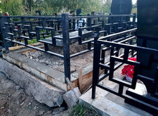 Изготовив трафарет, мы вновь вернулись на могилу и приступили к работе: первым делом мы тщательно пропололи участок, а затем демонтировали надгробья для более удобного нанесения надписи.