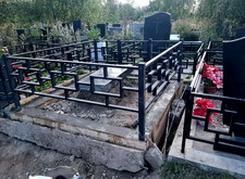 Когда от клиента было получено разрешение приступить к работам, мы вновь вернулись на кладбище. Могила к этому времени приобрела довольно-таки неприглядный вид: место захоронения полностью заросло травой, практически скрыв памятник. Это проблему заказчик предпочёл решить наземным покрытием.