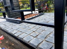 Затем мы приварили стальные полосы к опорам ограждения, тем самым создав необходимый для гранитной брусчатки периметр.